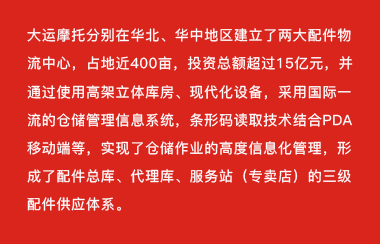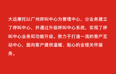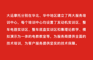 大运摩托 坚持"以客户为中心"搭建全球服务体系,通过整合国内外服务资源,建设配件物流中心、服务培训中心、呼叫中心三大共享平台,为全球大运客户提供优质的一站式服务。