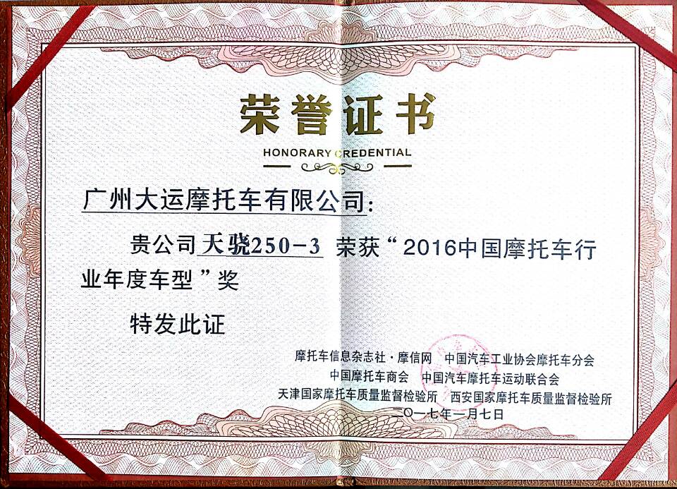 2017年1月荣获中国摩托车行业年度车型奖-凯发k8pa